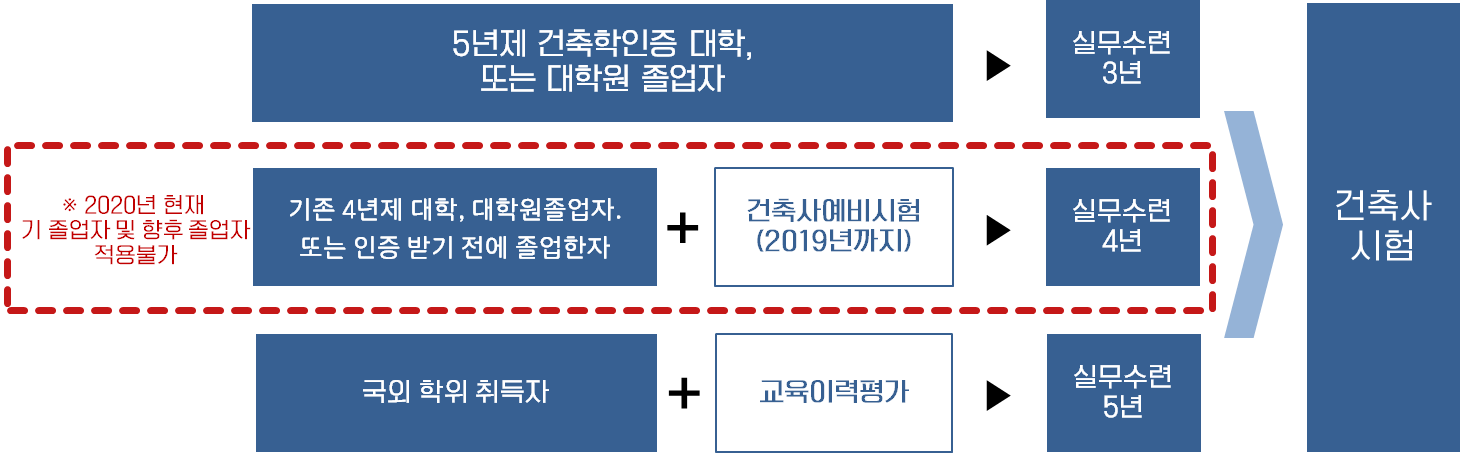 지난 2011.5.30 개정되어 시행된 현행 건축사법에 따라 2020년부터 건축사 예비시험이 폐지되어 2019년까지 예비시험에 합격하지 않은 사람 또는 5년제 이상 건축학교육을 이수하고 3년(또는 4년)이상의 실무수련을 완료하지 아니한 사람은 2020년부터 건축사 시험에 응시할 수 없습니다.